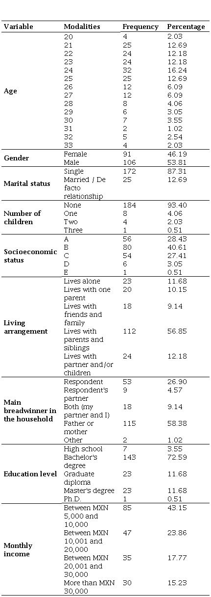 It was found that most participants (68.02%) were of middle socioeconomic status; 3.55%, low status; and 28.43%, high status. Regarding household composition, 67.01% lived with their family; 12.18%, with their partner and/or children; and 20.81%, alone or with friends. Accordingly, for most of them, their parents, relatives, or partner provided their main economic support (63.96%), while the rest (36.04%) made an economic contribution to the household. In terms of education level, most (72.59%) had a bachelor's degree; 26.86%, a graduate degree; and only 3.55%, a high school diploma. With respect to income level, most (43.15%) earned a salary between MXN 5,000 and 10,000, followed by those in the range between MXN 10,001 and 20,000 (23.86%), those between MXN 20,001 and 30,000 (17.77%), and, finally, those who earned more than MXN 30,000 (15.25%, i.e., the lowest percentage).