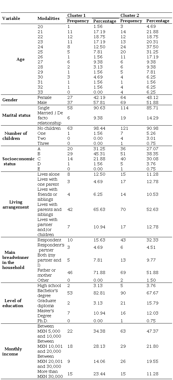 Source: own workThe sociodemographic variables classified by cluster in Table 2 show that Cluster 1 concentrates the youngest population. Consequently, they have the lowest number of children, and their main economic support comes from their parents. In the rest of the variables, both clusters exhibited similar characteristics.