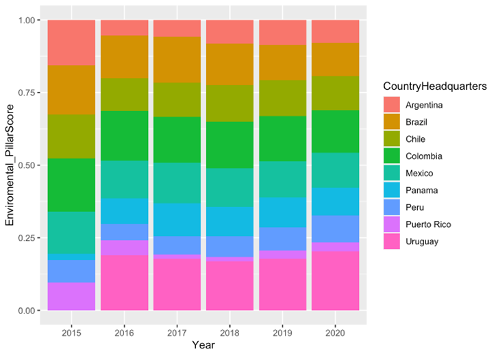 Source: Own work using R Project.Figura 2. Media anual de la puntuación del pilar ambiental en los países de América Latina