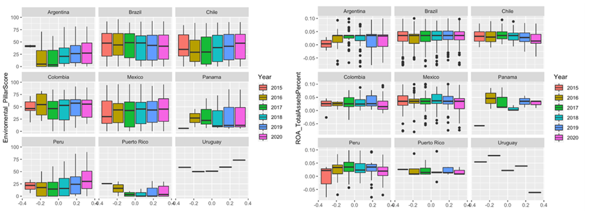 Source: Own work using R Project.Figura 3. Puntuación del pilar medioambiental y rendimiento de los activos en cada país por año
