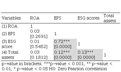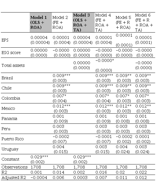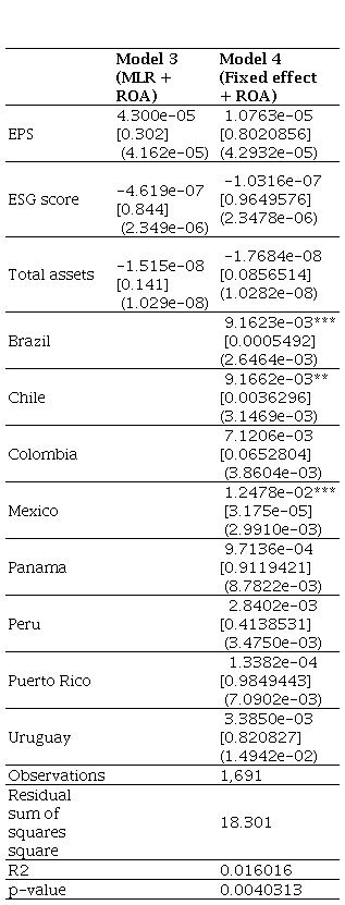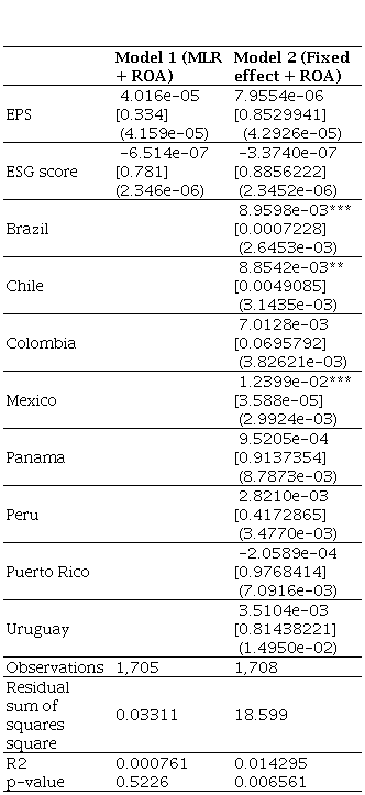 Source: Own work using R Project. ***p-value < 0.001, ** p-value < 0.01, * p-value < 0.05Moreover, the results of regression model 2 suggest that there is no significant relationship between the EPS and firm performance for Latin American firms based on the analyzed data. Nonetheless, there was a slight increase in the ROA of the three countries under study as the years passed by. Importantly, ROA and the EPS in the correlation matrix were lower than those in regression model 2. Furthermore, as mentioned by Farza et al. (2021), there is no clear-cut relationship indicating that the EPS directly increases or decreases ROA in firms. What is important is that banks and insurance companies are now evaluating the environmental performance of their clients and adjusting lending conditions accordingly.