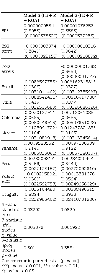 Source: Own work using R Project.As observed in Table 7, the findings underscore the significance of Brazil, Chile, and Mexico in the analysis, with estimators demonstrating a remarkable degree of consistency, even when incorporating the year as a fixed effect. Focusing on firm performance, regression model 2 remains relevant. However, it is crucial to note that the ESG score did not yield a statistically significant impact on firm performance. This implies that an increase in the ESG score does not unequivocally translate into enhanced effectiveness for Latin American firms or improved overall firm performance. As reported by González-Ruiz et al. (2023) and Mejia-Escobar (2020), Brazil, Chile, and Mexico possess some of the most developed capital markets in the region and offer incentives and have regulations that allow firms to invest in environmental performance. As a result, these countries lead the green bond market in the region (Mejía-Escobar et al., 2021).