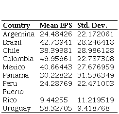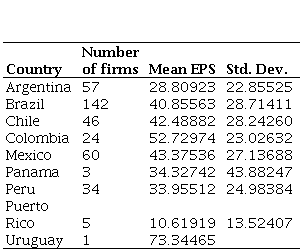 Furthermore, the analysis of the mean EPS for the study periods reveals that, in the majority of the countries, the mean EPS is above 30, with a standard deviation greater than 20, as reported in Table 3. This suggests that over the last years, Latin American firms have seen an increase in the number of them reporting their EPS, as well as an improvement in the EPS results. Importantly, these results are not that statistically significant, given the number of firms that were included in the analysis. However, it seems that the firms have managed to maintain their EPS levels, as shown in Figure 2.