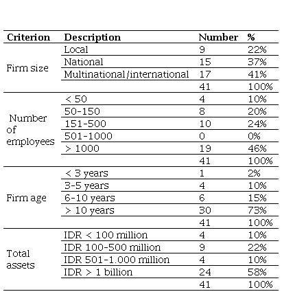 Table 2 shows that the largest percentage of companies sampled in this study are multinational or international firms with more than 1,000 employees that have operated for more than 10 years and have assets worth more than one billion rupiah.