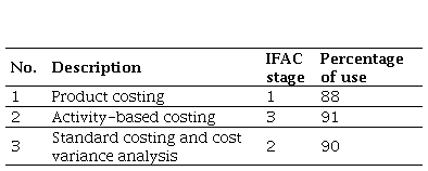 MAPs for costing systems can be classified into three categories: product costing, activity-based costing, and standard costing. Most firms in the sample have implemented product costing. This can be seen in the percentage of companies that have implemented a costing system: more than 80% (see Table 3). These results support the research by Adu Gyamfi and Chipwere (2020), Terdpapong et al. (2019), and Mehta and Bhojwani (2020). The management of these firms have clearly understood the importance of calculating the cost of the goods they produce for planning, controlling, and making decisions.