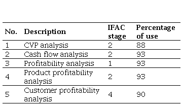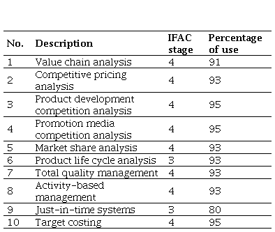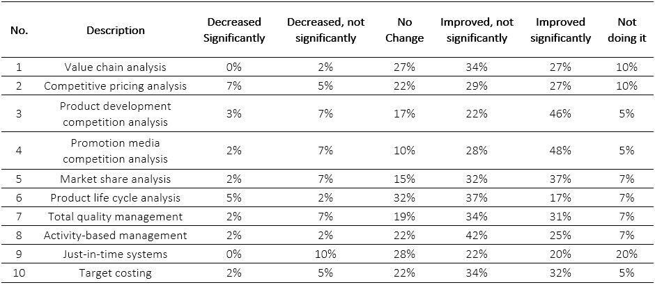 Profitability analysis encompassed a general analysis, as well as per-product and per-customer analyses. Conducting a profitability analysis on a per-product and per-customer level is crucial for deciding the best course of action in the event of a decrease in profit per product and customer. In this study, MAPs related to the business strategy focused on Stage 4 (creation of value) of the IFAC. According to the results, the majority of companies in the sample have implemented MAPs in their business strategies, as the percentages of almost all the indicators were above 90% (except for just-in-time systems, with 80%).As reported by Aksoylu and Aykan (2008), strategic costing can be categorized into five dimensions: activity-based costing, value chain costing, quality costing, life-cycle costing, and target costing. Importantly, strategic costing is one of the strategic management accounting techniques that can help companies improve their performance.