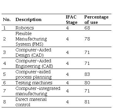 In this study, the adoption of MAPs in AMT was assessed using eight indicators. The results showed that the majority of the companies in the sample have implemented these technologies. These firms are, indeed, aware of the fact that, due to the development of IT and increasingly fierce competition, companies should transform their production processes. In this respect, Amara and Benelifa (2017) claim that MAPs should be able to anticipate changes in the external and internal environment. Likewise, Tuan Mat and Smith (2014) hold that contemporary MAPs, such as AMT, activity-based costing, computer-aided design, computer-aided manufacturing, and robotics, are being employed to cope with changes in the environment.
