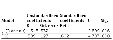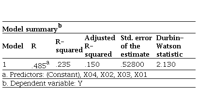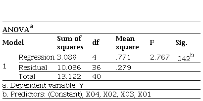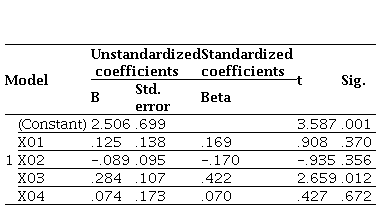 Source: Software output.From the results obtained for the unstandardized coefficients (B), it is possible to derive the following equation: Y = 2.506 + 0.125 X1- 0.089 X2 + 0.284 X3 + 0.074 X4 + €.