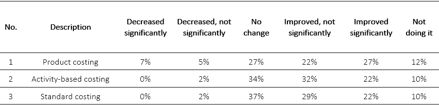 Source: Data processed by the author.The evidence suggests that the Covid-19 pandemic changed the implementation of different types of MAPs—increasing or decreasing their utilization. Nevertheless, at some companies, the implementation of MAPs has not changed due to the pandemic. The results in Table 7—obtained from 41 questionnaire responses—detail the impact of the Covid-19 pandemic on MAPs for costing systems (shown as a percentages).