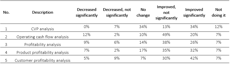 Source: Data processed by the author.Regarding decision-making using management accounting information, 13% - 49% of the companies in this study saw a nonsignificant increase in accounting information use, whereas 20% - 42% experienced a significant increase attributed to the impact of the Covid-19 pandemic. Except for the CVP analysis, most firms experienced no changes in MAP implementation due to the pandemic. Moreover, 5% - 12% of companies witnessed a decrease in cash flow and profitability. Based on the information presented in Table 8, the impact of the pandemic on decision-making was, on average, high. The management of these firms should be able to make appropriate and quick decisions to anticipate changes in business processes resulting from the Covid-19 pandemic.