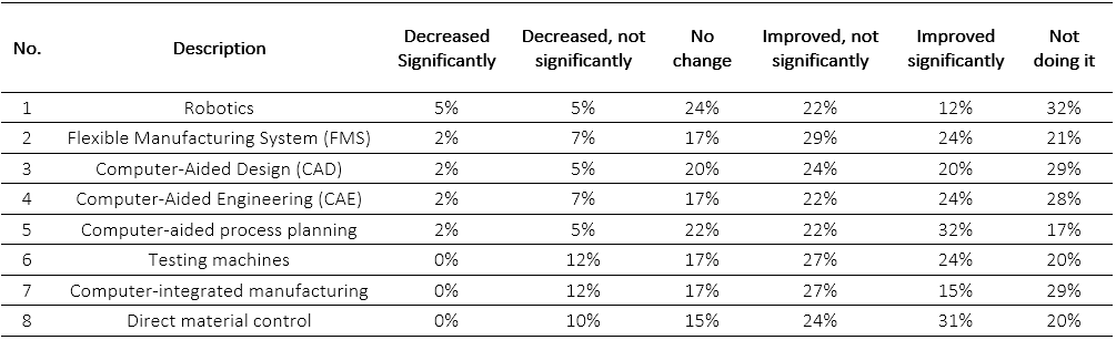Source: Data processed by the author.Table 10 shows that, on average, the companies in this study increased their implementation of MAPs for AMT during the Covid-19 pandemic. Notably, 12% - 32% of the companies experienced a significant increase, with computer-aided process planning exhibiting the highest increase and the use of robotics in the production process seeing the smallest increase. A decline in the use of advanced technology was only observed in a few firms (2% - 12%). Also, many companies reported not to adopt MAPs for AMT. Since the pandemic imposed restrictions on activities, firms were compelled to reduce the use of human resources in direct production and opt instead for computer-based solutions. Additionally, 15% - 24% of the companies experienced no changes in the use of advanced technologies.