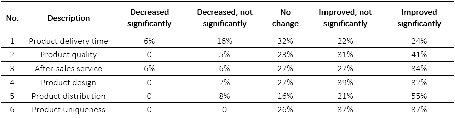 Source: Data processed by the author.Concerning product performance—which was measured using six indicators—Table 11 reports that 21% - 55% of the companies in the sample showed an increase in product performance, 16% - 32% exhibited no changes, and only 6% - 16% experienced a decrease. From this, it is clear that the Covid-19 pandemic had a positive impact on product performance.