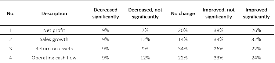 Source: Data processed by the author.In this study, firms’ financial performance was measured using indicators such as net profit, sales growth, return on assets, and operating cash flow. As observed in Table 12, 22% - 38% of the companies in the sample increased their financial performance during the Covid-19 pandemic, with the highest changes and improvements reported in sales growth. Meanwhile, 14% - 34% of the companies did not report a change in their financial performance. Notably, the most stable indicator was return on assets. Decline in financial performance was only observed in a few companies, with the most significant decline observed in operating cash flow.