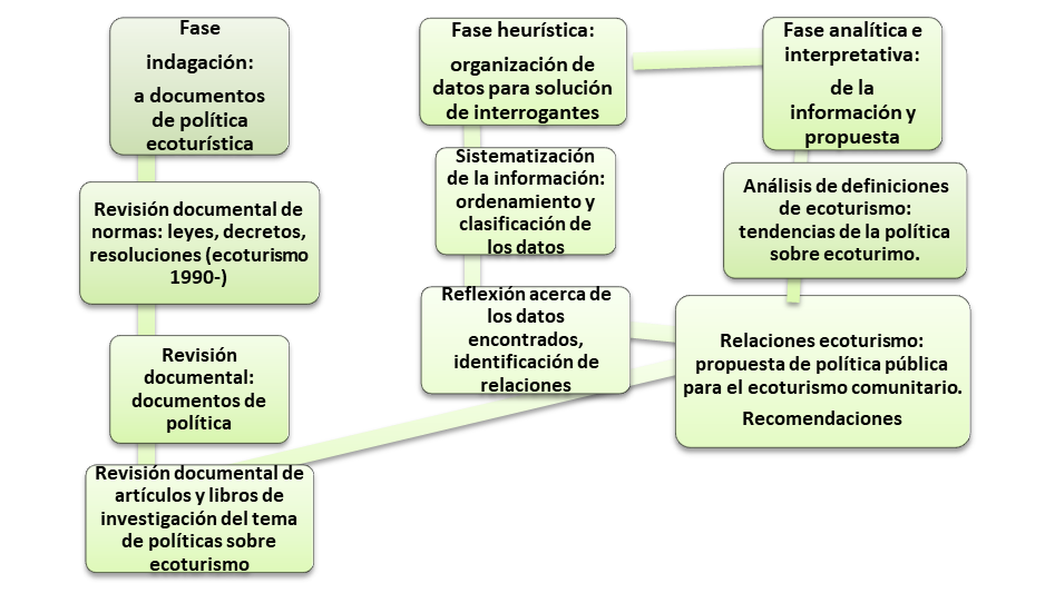 La primera fase, la indagación, se ejecutó mediante la revisión a los documentos de política ecoturística con base en la pregunta formulada en el problema de investigación, y en las subpreguntas del proyecto de investigación realizado en la Universidad de la Amazonia con el apoyo financiero del Ministerio de Ciencias, denominado: Estrategias socioculturales y ambientales para el fomento del ecoturismo comunitario en el Municipio de Florencia Caquetá (Código 64797. CT 18919). En esta fase se realizaron las siguientes actividades: la revisión documental a través de la búsqueda y selección de los documentos de carácter primario alusivos a las normas y políticas sobre el ecoturismo en Colombia (leyes, decretos, resoluciones, documentos bases de política sobre ecoturismo; artículo y libros resultados de la investigación sobre la temática objeto de estudio), en bases de datos como Legis Ámbito Jurídico, Legis Experta y Google académico. Las categorías de búsqueda fueron: políticas públicas ecoturismo/turismo de naturaleza; normas ecoturismo/turismo de naturaleza, leyes ecoturismo/turismo de naturaleza.