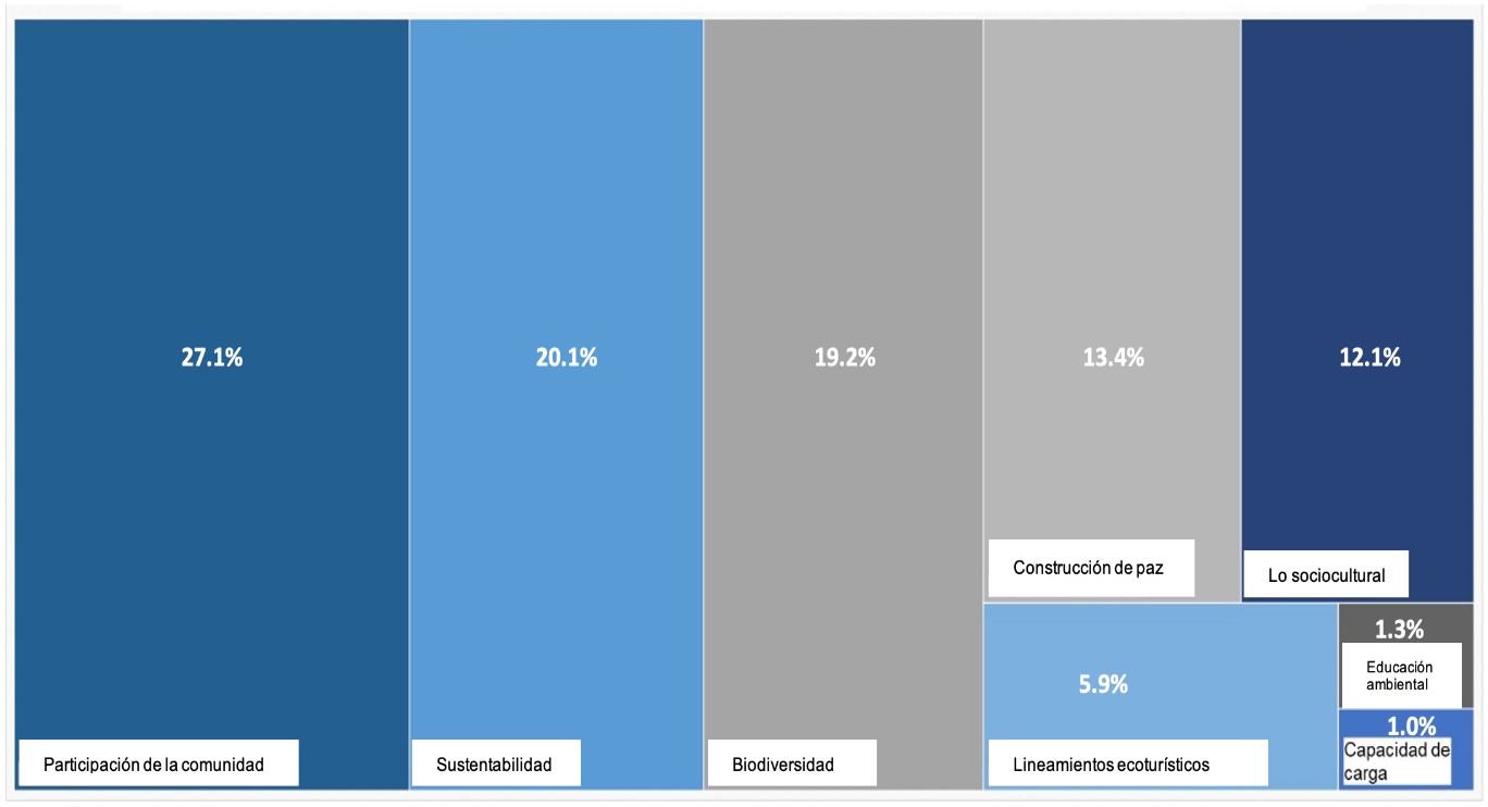 Las categorías fueron: sustentable, biodiversidad, capacidad de carga, participación de la comunidad, educación ambiental, aspectos socioculturales, lineamientos ecoturísticos, construcción de paz, inserción laboral. Estas categorías se buscaron en los documentos y se cuantificaron para analizarlos después de su codificación y sistematización.