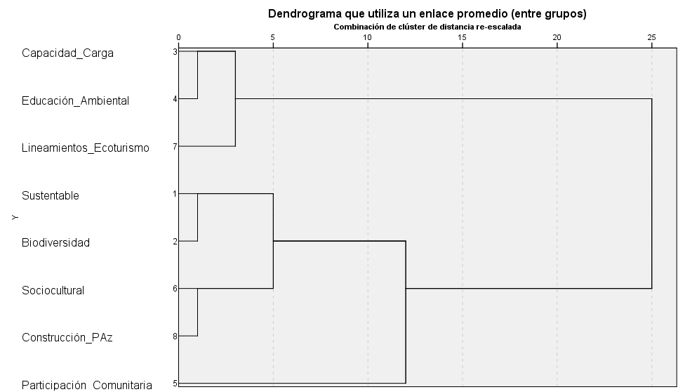 Fuente: elaboración propia a partir de SPSS.En la Figura 3 se confirma que la categoría con mayor peso es la de la participación comunitaria. La comunidad es el eje de todo el proceso; en ella, se integra lo sociocultural y, en esta, la educación ambiental para abordar lineamientos del ecoturismo, lo sustentable y la biodiversidad. Asimismo, lo sustentable y la biodiversidad forman un clúster que en el campo de las políticas no tiene una representación significativa. Igual ocurre con el clúster de lo sociocultural y de la paz, y el de la capacidad de carga y educación ambiental. Esto indica que, si bien es cierto emergen conceptos fundamentales en pro de una sustentabilidad fuerte, aún la apropiación de su conceptualización y características es muy débil en los tomadores de decisiones de políticas públicas.