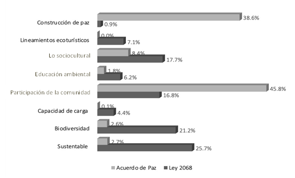 En general, los discursos sobre las categorías de análisis en los dos documentos del Acuerdo Final de Paz con la FACR-EP y Ley 2068 de 2020 van en contravía: a) la participación de la comunidad, con una diferencia del 29%; b) la construcción de paz, con el 37.7%; c) lo sustentable, con una diferencia de 23%, cuando sería la categoría principal porque tiene relación con la vida de la naturaleza y con la de los seres humanos; d) la biodiversidad, con el 18.6%; e) lo sociocultural, con el 9.3% de diferencia; f) la educación ambiental, que no tiene mayor relevancia en los dos documentos, tiene una diferencia de 4.4%. Los lineamientos sobre el ecoturismo y la capacidad de carga no es objeto de mención o regulación en el Acuerdo Final con la FARC-EP, en la Ley es muy poca, con el 7.1% y el 4.4%, respectivamente. Esto indica que desde el Estado se legisla en contravía de la realidad y de las potencialidades ecoturísticas de los territorios con más deterioro ambiental y de paz.