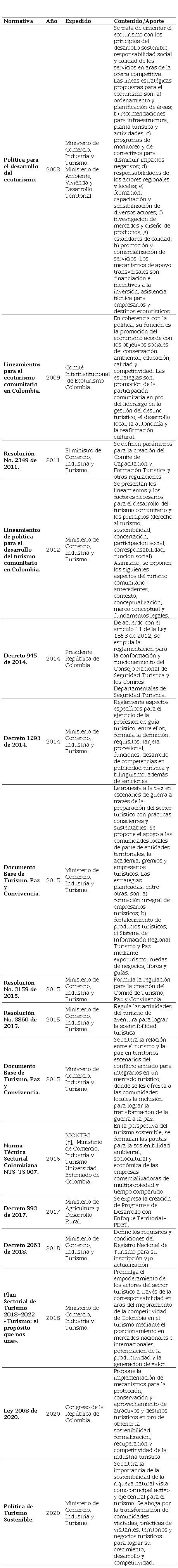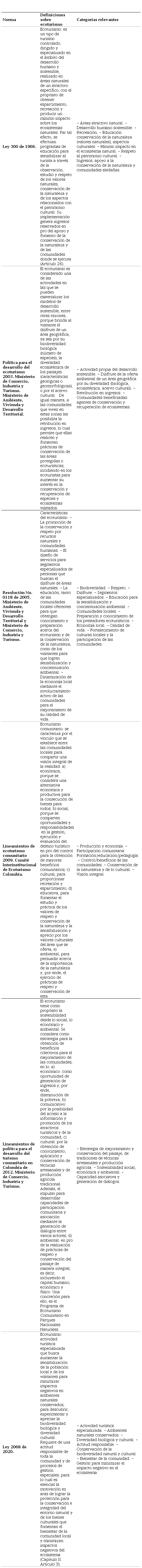 Findings: It was found that, in the legal-conceptual framework of the policies analyzed in this study, there was no fundamental transformation of ecotourism to implement the strong sustainability approach or plurality. Opportunities for labor inclusion were not explicit in these policies. The policy on community-based ecotourism proposed by the national government was composed of several aspects: the formulation of basic policies for productive development; valuation and implementation of processes for transitioning to civilian life from the perspective of the actors themselves; valuation and promotion of alliances and relations between different social agents in the territories and their participation in decision-making; special attention to security; prioritization of infrastructure investment; allocation of seed capital for entrepreneurship; tax and differential support for communities; education; improvement of digital connectivity; and promotion of research.