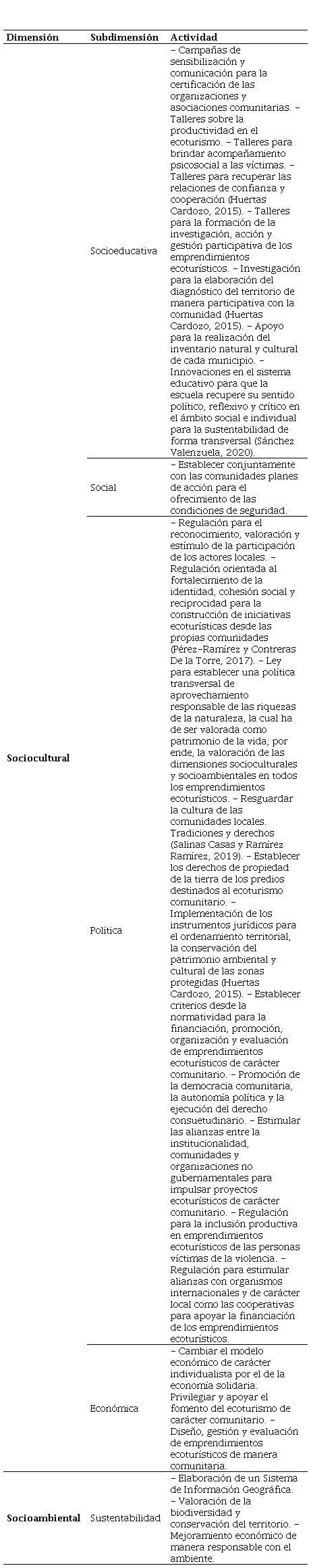 Concomitante con la aplicación de las políticas del ecoturismo después de la firma del Acuerdo de Paz con la FACR-EP, Del Cairo et al. (2018) plantean que la política pública no se ha materializado para superar la problemática estructural ambiental y rural y no se contribuye a generar transformaciones que favorezcan el fortalecimiento del ecoturismo comunitario, en tanto, proponen lo siguiente: la distribución equitativa en la comunidad de los beneficios obtenidos, diversificación de la producción agrícola para obtener soberanía alimentaria, realización de diálogos con el estamento estatal y las instituciones de cooperación internacional sin afectar la autonomía local, y reglamentación del acceso y uso de bienes para el servicio ecoturístico.