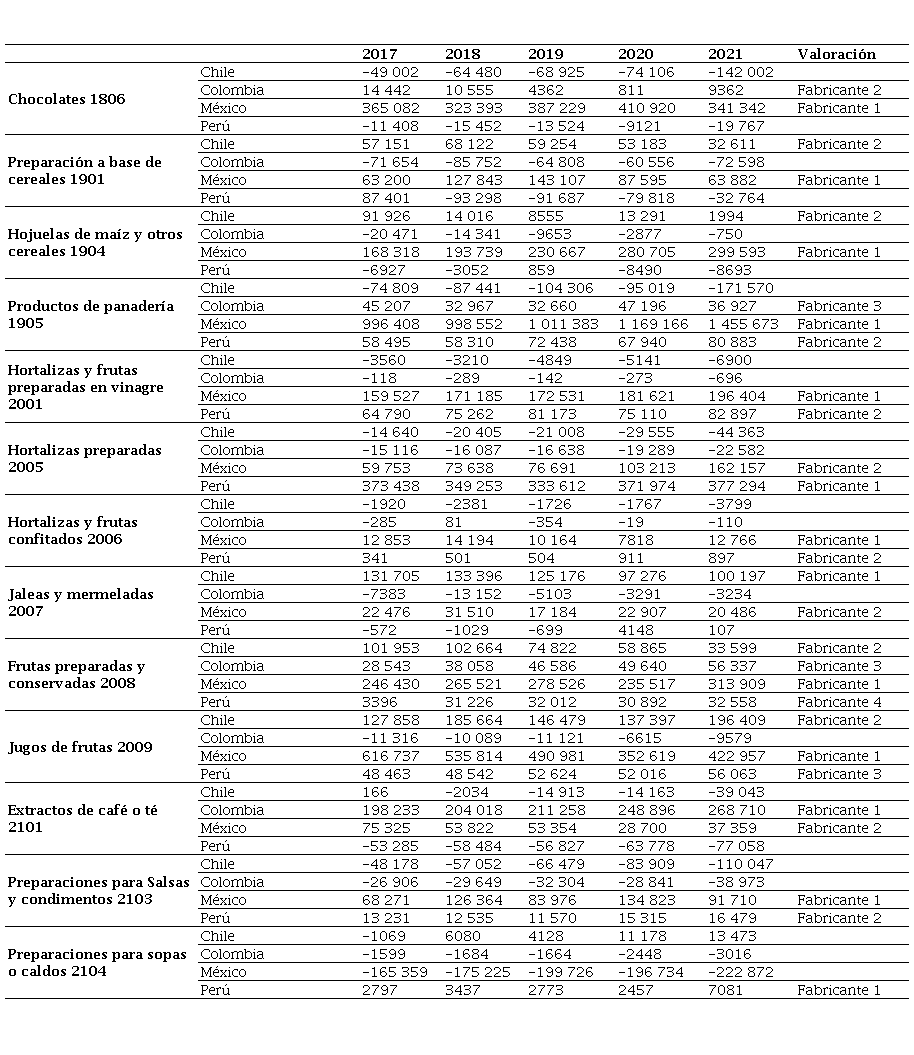 Se muestra el rol que las actividades productivas de cada país de la AP pueden desempeñar en las cadenas de valor regionales en las industrias de alimentos procesados. Inicialmente, se presentan los países que pueden ser fabricantes y, por tanto, exportadores de los productos finales de cada una de las cadenas y, posteriormente, los países aportantes de los insumos respectivos para la elaboración del bien final en cada una de las cadenas de valor. En la Tabla 4 se muestran los valores de los saldos comerciales de los bienes finales seleccionados para cada uno de los cuatro países miembros de la AP, entre los años 2017-2021, con su respectiva valoración, siguiendo los criterios expuestos en la sección metodología.