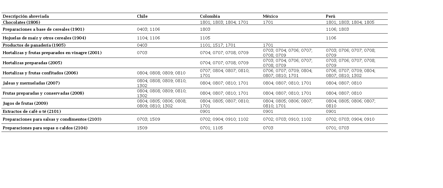 Fuente: elaboración propia.Se aprecia competencia en insumos entre Colombia y México como proveedores y exportadores en azúcar, productos intermedios en la cadena de cacao, café, frutas y algunas hortalizas. Entre Chile y Colombia, la competencia en insumos para las cadenas de valor es muy baja, tan solo se aprecia en algunas frutas. Chile, Perú y México compiten entre sí como proveedores en algunas hortalizas y frutas. Perú y Colombia compiten como proveedores en la cadena de chocolates, extractos de café, y en hortalizas y frutas.