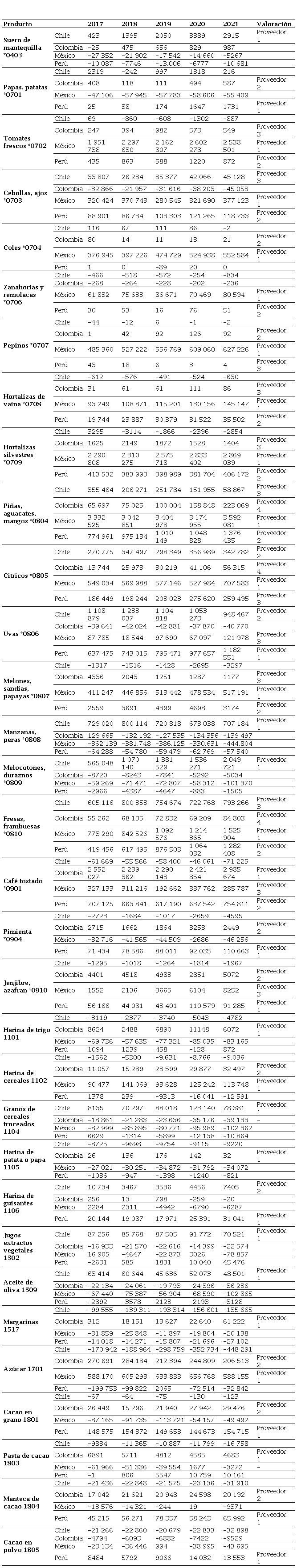 El criterio de valoración del potencial exportador de productos del sector de alimentos fue el comportamiento del saldo comercial, y se tomó un rango de tiempo continuo de cinco años para asegurar la consistencia de dicha tendencia (Bertamini, 2020). De acuerdo con ello, se incluyeron aquellos productos que presentaron saldo comercial positivo en todos los años, del 2017 a 2021, para al menos uno de los cuatro países miembros de la AP.