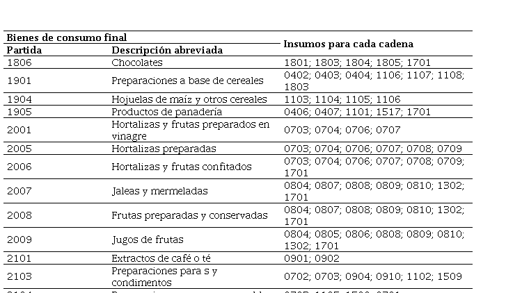 Con los productos incluidos, se hizo la selección de bienes finales y bienes intermedios y, posteriormente, se realizó la organización de las cadenas de valor regionales, como se muestra en la Tabla 3. Se incluyeron en total cuarenta y cinco productos, de los cuales trece corresponden a bienes finales y treinta y dos pertenecen a bienes insumos. En la Tabla 1 se presentan los bienes finales seleccionados, y en la Tabla 2, los bienes insumos.