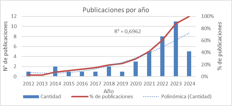 La tendencia ascendente en la generación de literatura académica, revelada a través de la fórmula de búsqueda, muestra un interés significativo en esta área de investigación. Se identificó un patrón de crecimiento cuadrático polinomial, con un coeficiente de determinación de 0.6962, lo que sugiere una rápida expansión en el volumen de trabajos publicados a lo largo del tiempo. Los años que destacaron por su alta producción fueron 2021, 2022 y 2023, como se ilustra en la Figura 1. Este incremento alcanzó su máximo en 2023, marcando un hito en la historia de publicaciones y evidenciando un punto culminante en términos de atención e importancia durante ese lapso.