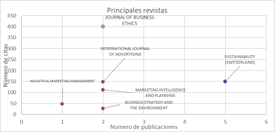 Fuente: elaboración propia a partir de Scopus y Web of ScienceEn el análisis de las revistas líderes en el campo, se distinguieron tres categorías distintas, tal como se ilustra en la Figura 3. La primera categoría incluye publicaciones como el Journal Of Business Ethics, las cuales se caracterizan por su alta productividad y significativo impacto en la ciencia. En contraste, un segundo grupo, que incluye a revistas como International Journal Of Advertising, Industrial Marketing Management, Marketing Intelligence And Planning, y Business Strategy And The Environment, se destaca principalmente por su impacto científico, a pesar de presentar una productividad reducida en términos de volumen de artículos. Finalmente, un tercer conjunto, con Sustainability (Switzerland) como ejemplo prominente, sobresale por su considerable productividad en la generación de investigación, aunque recibe un número menor de citas. Este panorama subraya la variedad de publicaciones que contribuyen al estudio del greenwashing y su influencia en las marcas, resaltando la necesidad de valorar, tanto la productividad, como el impacto de las revistas para determinar su importancia en este campo de estudio.