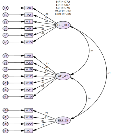 Fuente: elaboración propia.Las cargas factoriales ordenadas aquí presentadas muestran la relación significativa que tiene cada ítem con el factor que lo contiene, en consecuencia, el ítem que se señala en cada dimensión corresponde al que tiene el valor más alto en los tres factores, con lo cual se configura un nuevo modelo. Para confirmar esta nueva estructura factorial se procedió a realizar un AFC por medio del software AMOS® V24. Los métodos de estimación para el AFC se basaron en la propuesta de Valdivieso Taborga (2013), donde el modelo de medida y su estructura factorial es adecuado si los indicadores comparativos de ajuste (NFI y RFI) e indicadores de proporción de varianza (GFI y AGFI) sobrepasan el valor de 0.9. De igual manera, el modelo es adecuado si los índices basados en residuos (RMR y SRMR) no sobrepasan el umbral de 0.08.