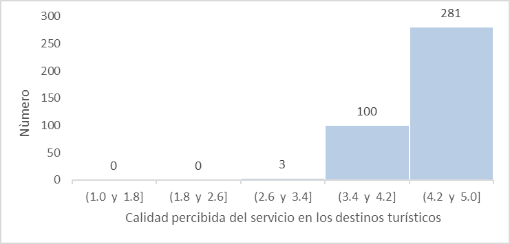 Fuente: elaboración propia.La representación de los resultados muestra un histograma con marcado sesgo a la izquierda y acumulación de datos por el lado de valores altos de la calidad percibida del servicio. Buena parte de los turistas (73 %) tienen una muy buena CPS recibido con valores superiores o iguales a 4.2. El 26 % de los encuestados calificaron el servicio por debajo de 4.2, inferior a bueno, lo que demuestra que existe una franja con la posibilidad de realizar mejoras en la prestación del servicio.