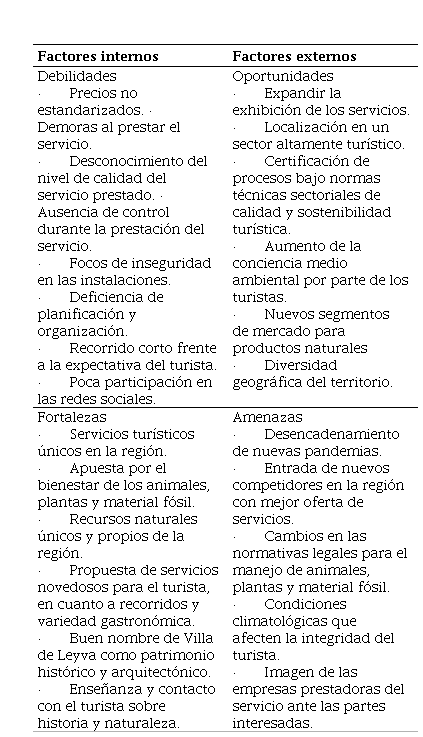 Table 1. Global SWOT matrix of tourist attractions in Villa de Leyva