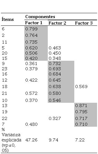 A partir de los resultados del AFE se tiene una nueva estructura de un modelo multidimensional con tres factores, los cuales en conjunto explican en total el 64.21 % de la varianza total acumulada. Las variables que componen el modelo con sus cargas factoriales se muestran en la Tabla 2.