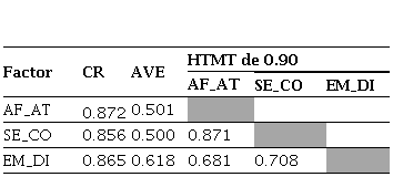 Los resultados anteriores son validados mediante un análisis factorial confirmatorio (AFC) con el uso de un modelo de ecuaciones estructurales (SEM) (Anderson y Gerbing, 1988). En este sentido, los indicadores comparativos de ajuste, indicadores de proporción de varianza e índices basados en residuos muestran un buen ajuste del modelo, lo cual corrobora lo hallado en el AFE. Como señal de validez convergente, se tiene en cuenta los indicadores de: confiabilidad compuesta (CR), varianzas promedio extraída (AVE) y cargas factoriales estandarizadas del modelo. Igualmente, para buscar validez discriminante se analiza el indicador de heterorrasgo-monorrasgo (HTMT, por sus siglas en inglés).