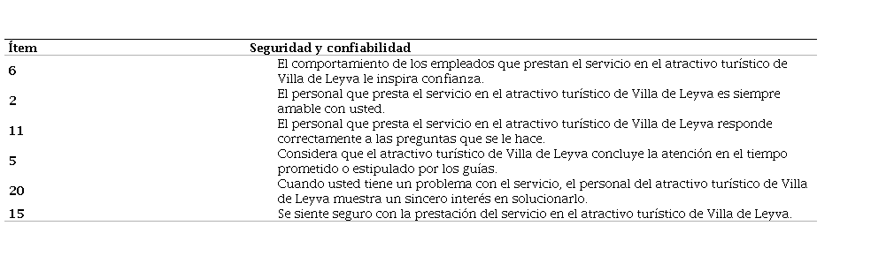 Fuente: elaboración propia.Como se indica en la Tabla 4, los seis elementos mencionados pueden estar relacionados con las experiencias de los turistas al evaluar la actuación de los empleados que prestan el servicio y la seguridad que estos perciben al recibirlo en cualquier circunstancia (Yusof et al., 2014). Estos elementos se pueden enmarcar en un factor que en adelante se denomina «seguridad y confiabilidad».