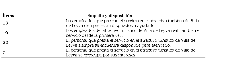Fuente: elaboración propia.Los ítems que aparecen en la Tabla 6 se pueden vincular con algunos comportamientos de los empleados de los atractivos turísticos rurales, quienes reflejan un constante interés y disposición para participar de manera efectiva y oportuna durante el recorrido, dando un servicio libre de no conformidades que puede generar algún malestar en los visitantes. Estos aspectos del servicio se pueden unificar en dos conceptos vinculados con «empatía y disposición».