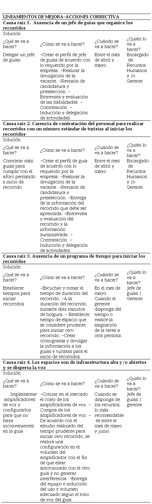 Basados en lo anteriormente expuesto, y a partir de la experiencia del equipo participante, se consideran estas como las causas raíz del problema. De este modo, se estima apropiado implementar un plan de mejoramiento con las acciones específicas para eliminar cada causa raíz y, por lo tanto, resolver la problemática encontrada. Para cada causa raíz, en la Tabla 8 se plantean las acciones concretas a implementar por parte de los gestores de los atractivos en estudio. Allí se observa el qué, cómo, cuándo y quién llevará a cabo la contramedida implementada para cada causa raíz detectada. Para atacar la Causa raíz 1, se recomienda delegar un jefe de guías; para la Causa raíz 2, contratar más guías de tal modo que se cumpla con el aforo permitido al inicio del recorrido; la contramedida de la Causa raíz 3, consiste en establecer tiempos para iniciar y finalizar los recorridos para que el turista no pierda tiempo en filas extensas; y la Causa raíz 4, se recomienda como plan de acción la implementación de amplificadores de voz que puedan utilizar satisfactoriamente los guías en cada recorrido.