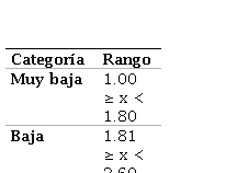 Fuente: elaboración propia.Finalmente, se recurrió al método de extracción de componentes principales y al método de rotación Varimax, en donde, la correlación anti-imagen excluye la variable pensamiento gerencial, lo que quiere decir que no se está dando acatamiento al criterio de unidimensionalidad, por lo tanto, se tomó la decisión de eliminar este factor, dado que su carga factorial no es representativa, teniendo en cuenta el criterio de Kaiser de mantener los factores de mayor autovalor. Adicionalmente, con base en la valoración de las calificaciones de los sujetos en las nuevas dimensiones identificadas, se determinó el perfil emprendedor de los jóvenes universitarios en el contexto del departamento de La Guajira, aplicando un cuestionario estilo Likert con opciones (muy de acuerdo, de acuerdo, ni de acuerdo ni en desacuerdo, en desacuerdo, muy en desacuerdo). Para el análisis e interpretación de los resultados se elaboró un baremo (ver Tabla 2).