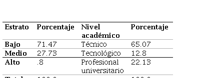 Fuente: elaboración propia.En referencia al estrato socioeconómico en el cual se desarrollan, se evidenció que el 71.47 % de los jóvenes residen en estrato bajo, el 27.73 % en estrato medio y solo 0.8 % en estrato alto. En lo que respecta al nivel académico, el 65.07 % poseen un nivel técnico, el 22.13 % son profesionales o universitarios y el 12.8 % restante tienen estudios tecnológicos.