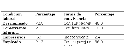 En lo atinente a la situación laboral de los profesionales, el 72.8 % no cuentan con un empleo, el 20.3 % se desempeña como comerciante informal, el 4.27 % tiene otra condición laboral, el 2.13 % son empleados y el 0.53 %, empresarios. En cuanto a la forma de convivencia, los resultados evidencian que el 48 % residen con sus padres, el 36 % con su pareja e hijos, el 12 % con familiares, el 2.4 % es independiente y el 1.6 % vive con otras personas (ver Tabla 4).