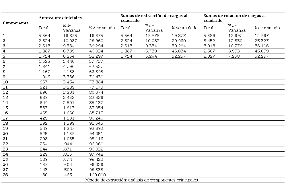 Seguidamente, se aplicó el método de extracción de componentes principales y el método de rotación Varimax, en donde la correlación anti-imagen excluye el factor pensamiento gerencial, lo que quiere decir que en este primer análisis no se está dando cumplimiento al criterio de unidimensionalidad, por lo que se tomó la decisión de eliminar este factor, dado que su carga factorial no es representativa, teniendo en cuenta el criterio de Kaiser de conservar los factores de mayor autovalor. Con ello, se identificaron cinco factores que explican el 52.297 % de la varianza de respuesta al test (ver Tabla 6).
