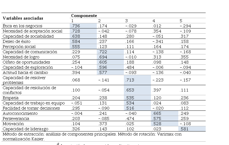 Para la realización del estudio, buscando reducir el número de factores, se aplicó el análisis factorial, técnica que permitió determinar la dimensionalidad de los ítems presentes en el perfil emprendedor, utilizando para ello el programa estadístico informático SPSS, empleando el método de extracción denominado «componentes principales», con el fin de establecer cuáles son aquellos que cumplen con los ítems.