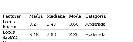 Respecto al locus interno, consideraron como características representativas del perfil emprendedor los factores: capacidad de comunicación y actitud hacia el cambio, lo cual indica que se esfuerzan por lograr sus metas, aprovechando las oportunidades que les puede brindar los cambios que permanentemente permean la actividad empresarial.