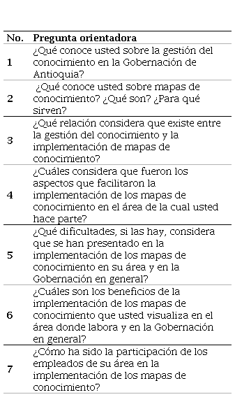 El instrumento utilizado para la recolección de información fue la entrevista semiestructurada como elemento técnico de gran utilidad en la investigación cualitativa, por medio del cual se aplicaron siete preguntas elaboradas de manera abierta (ver Tabla 1), conservando una estructura flexible, dinámica y no directiva (Díaz-Bravo et al., 2013). La entrevista permitió conocer la percepción de los empleados clave que hacen parte de las diferentes dependencias de la entidad objeto de estudio, respecto a cada uno de los beneficios y las dificultades experimentadas en la implementación de la herramienta de mapas de conocimiento.