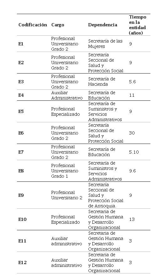 Se desarrollaron diez entrevistas en la que participaron doce servidores públicos de diferentes áreas de la Gobernación de Antioquia, tal como consta en la Tabla 2. La entrevista número diez se realizó de manera grupal y contó con la participación de los entrevistados E10, E11 y E12, los cuales hacen parte del equipo técnico que coordina las actividades de implementación de la GC en la entidad. Se utilizó un muestreo intencional para identificar a los potenciales entrevistados, técnica esta que identifica a las personas que tienen un conocimiento especial o experiencia con el fenómeno de interés (Creswell et al., 2007). En este sentido, se construyó una base de datos con los empleados que potencialmente podían ser entrevistados y se les envió una invitación en articulación con el área que coordina el tema de GC en la entidad. La base de entrevistados estaba conformada por personas que habían sido capacitados en temas de GC en la organización y que a su vez habían participado en el despliegue de los mapas de conocimiento en diferentes áreas. En la Tabla 2 se describe un breve perfil de los consultados. Las entrevistas se desarrollaron entre los meses de julio y septiembre de 2022. El número de entrevistas desarrolladas consideró el criterio de saturación teórica, el cual se alcanza cuando el investigador recopila datos y no se añade nada nuevo al análisis (Bowen, 2008).