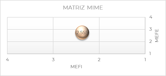 De acuerdo con Guerrero Calderón (2018), la matriz MIME establece las estrategias a largo plazo que una empresa debe adoptar, ya sea enfocadas en el crecimiento, en mantener su posición actual o en reducir sus operaciones. Ofrece una visión completa de las futuras estrategias; es decir, da la pauta global de la empresa y el camino a seguir. Igualmente, Cañón Pardo y Moreno Varon (2016) definen la matriz MIME como la combinación de las matrices MEFI y MEFE, ya que cruza la información de estas dos y diseña un gráfico de acuerdo con el resultado obtenido. MIME, por su parte, está diseñada para dar origen a la toma de decisiones generales.