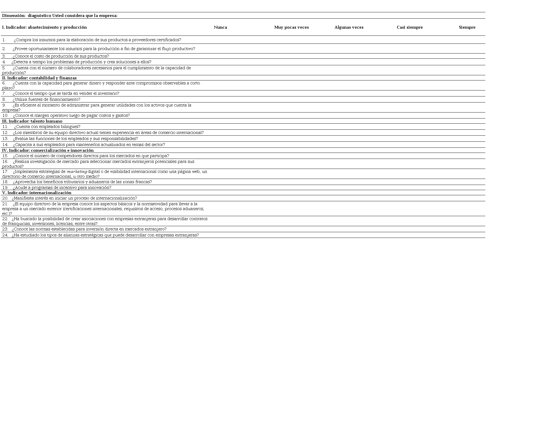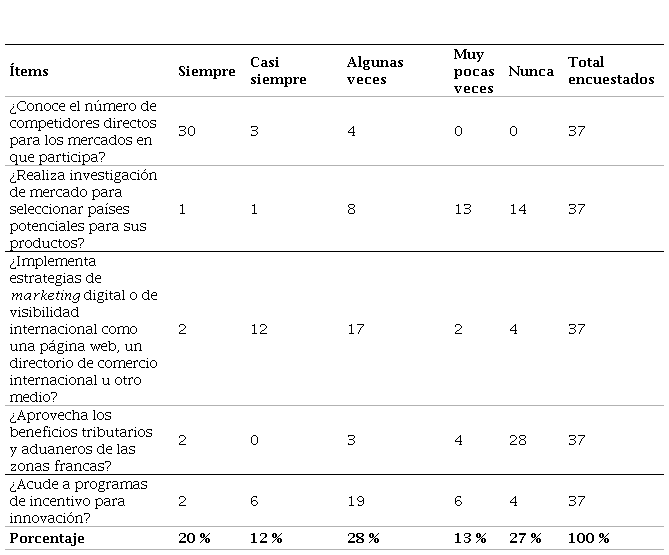 Fuente: elaboración propia.El porcentaje mayor de este indicador se encuentra en un 27 %, lo cual indica que las empresas encuestadas nunca aprovechan los beneficios tributarios y aduaneros de las zonas francas. El 13 %, muy pocas veces realiza investigación de mercado para seleccionar países potenciales para sus productos. El 28 % acuden algunas veces a programas de incentivo para innovación. El 12 % de las empresas casi siempre implementa estrategias de marketing digital o de visibilidad internacional, como una página web, un directorio de comercio internacional u otro medio. Por último, el 20 % de las mipymes siempre conoce el número de competidores directos para los mercados en los que participa (ver Tabla 7).