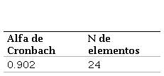 Fuente: elaboración propia.En este caso, el resultado que arrojó el alfa de Cronbach fue de 0.902 para los veinticuatros ítems del instrumento, lo cual, según Hurtado de Barrera (2015), es un instrumento confiable y, según Chaves-Barboza y Rodríguez-Miranda (2018), la confiabilidad es excelente, ya que entre más cerca a uno este el coeficiente alfa de Cronbach obtenido, más alto será el grado de confiabilidad. Como 0.902 > 0.7 mínimo aceptable, entonces se puede decir que el instrumento SÍ es confiable. Su fiabilidad es excelente. En la tabla 3 se observa la valoración de la fiabilidad según el coeficiente de Cronbach.