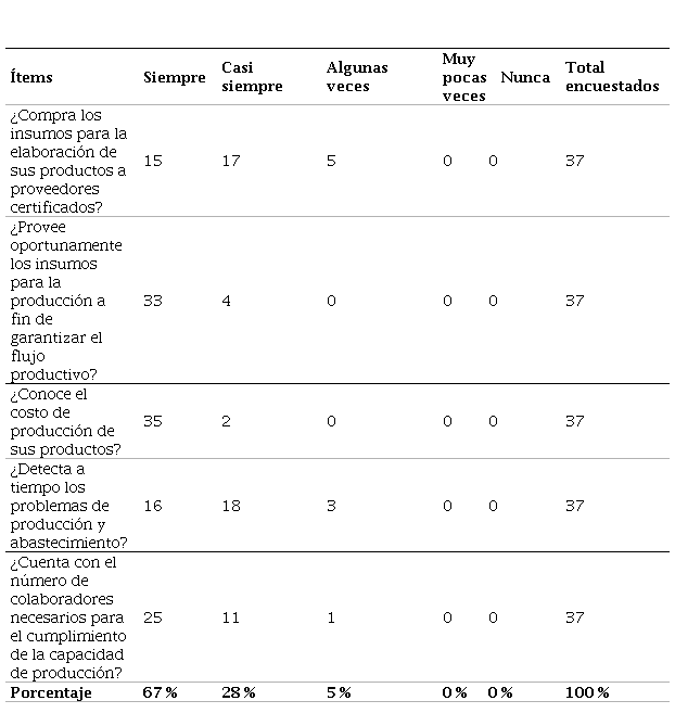Por otro lado, el 28 % de las personas encuestadas indicaron que casi siempre las empresas compran los insumos para la elaboración de sus productos a proveedores certificados, lo cual genera cierto grado de confiabilidad en la cadena de suministro. Además, detectan a tiempo los problemas de producción y abastecimiento, apuntando una gestión proactiva en las operaciones diarias de las mipymes del sector. Sin embargo, existen algunas estrategias que no se están desarrollando eficientemente y que impiden alcanzar el 100 % de efectividad en este indicador. Por ejemplo, algunas veces las empresas cuentan con el número de colaboradores necesarios para el cumplimiento de la capacidad productiva, lo que denota un nivel de implementación considerablemente bajo.