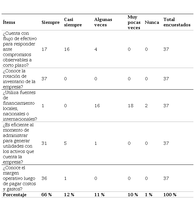 Table 5. Distribution of the accounting and finance indicator of agro-industrial MSMEs in Valledupar